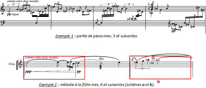 Le paysage sonore s’ouvre sur une longue pédale d’où émerge une ligne aux rythmes souples et irréguliers au piano (exemple 1). Vient s’y superposer une mélodie dépouillée à la flûte (exemple 2).