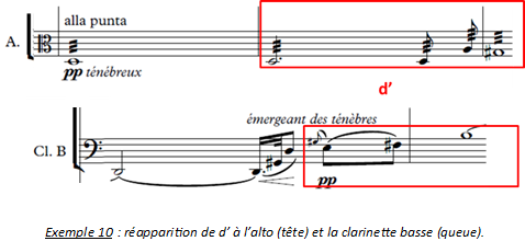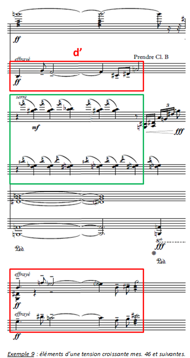 Le motif d-d1 (d’) réapparaît à deux reprises à la clarinette/clarinette basse et aux cordes dans cette partie où la tension devient maximale. Divers éléments y contribuent (cf. exemple 9) :