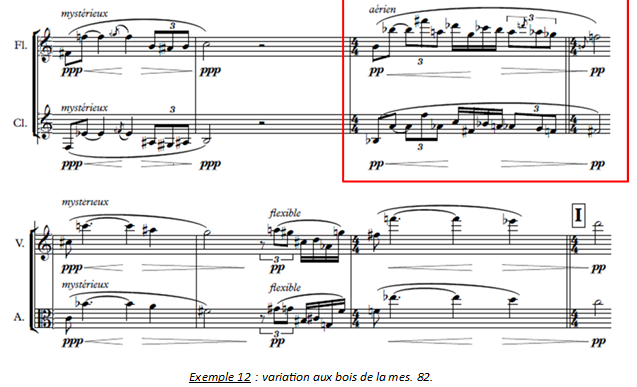 Cependant, nous avons préféré la distinguer dans cette analyse car elle reprend les éléments de la partie A3 « l’humanité renaît à la vie », comme l’illustre l’exemple 12, qui montre par ailleurs comment les parties de flûte et de clarinette sont traitées en variation mes. 82, en y introduisant des motifs déjà entendus précédemment.