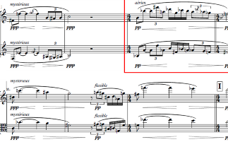• La flûte est attirée vers le suraigu dans lequel elle reste obstinément (flatterzunge) [3]. Dans le même temps, la basse du piano descend jusqu’aux notes les plus graves du clavier (clusters) [4].