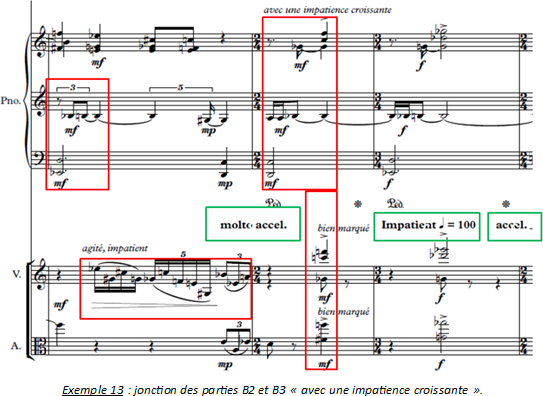 Intéressons-nous maintenant à la jonction de cette partie avec la suivante. On remarque tout d’abord mes. 83 à 86 un rappel au piano de la tête du motif entendu mes. 26 sous forme de Klangfarbenmelodie (cf. exemple 13). Son flux s’agite (triolet de croches vs. croches). Le trait rapide au violon génère aussi une impatience que l’indication molto accelerando renforce juste avant que le motif au piano ne passe en doubles croches et soit ponctué par un accent en double cordes au violon et à l’alto). L’indication métronomique devient plus rapide.