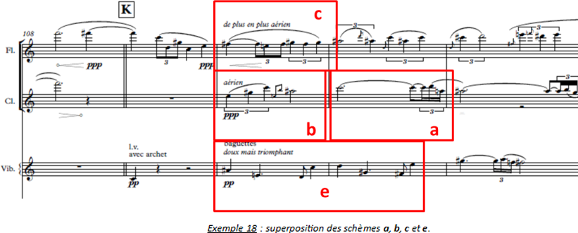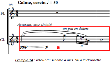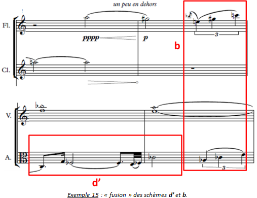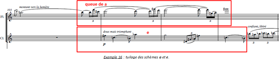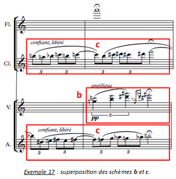 Enfin, alors que les deux bois et les deux cordes sont montés dans l’aigu de leurs registres respectifs, citons la superposition du schème c, dont les broderies caractéristiques ont perdu leur caractère douloureux (les ¼ de tons sont remplacés par des ½ tons, ce qui n’y est pas étranger) et du schème b entonné par le violon en une angélique mélodie d’harmoniques à peine audible dans le suraigu.