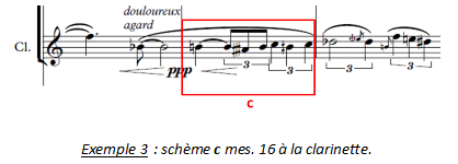 La mélodie de clarinette, toute en intervalles conjoints, tente de s’élever (sommet mes. 18) mais retombe inexorablement : on ne parvient pas à s’extirper de la douleur. L’utilisation de ¼ de tons renforce cette atmosphère. A cet égard, notons le schème c et ses broderies au ¼ de tons (ex. 3).