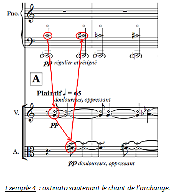 Venons-en maintenant à l’ostinato. Son importance dépasse largement le soutien qu’il offre au chant de l’archange : c’est en effet un élément générateur pour la suite. Il est formé par la succession de notes jouées en harmoniques au piano (doigt pinçant la corde), au violon et à l’alto : les notes do-sol-fa dièse-ré se suivent, tout en étant « éclatées » entre le grave et l’aigu du spectre sonore.