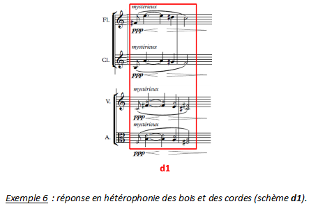 Les deux bois et les deux cordes répondent à d par d1, également en hétérophonie.