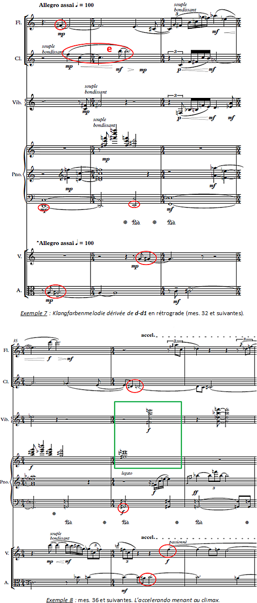 Tout d’abord, nous entendons mes. 32 une « Klangfarbenmelodie » [2] dérivée de l’ensemble d-d1 (cf. exemple 7) : la succession des notes cerclées en rouge est en effet apparentée à d-d1 en sens rétrograde. Nous soulignons plus particulièrement le schème e à la clarinette car il sera développé plus loin. A ce stade, le débit reste régulier et calme (successions de croches et/ou de noires). On observe des réponses en imitations au piano (main droite) et au vibraphone (mes. 32-33).