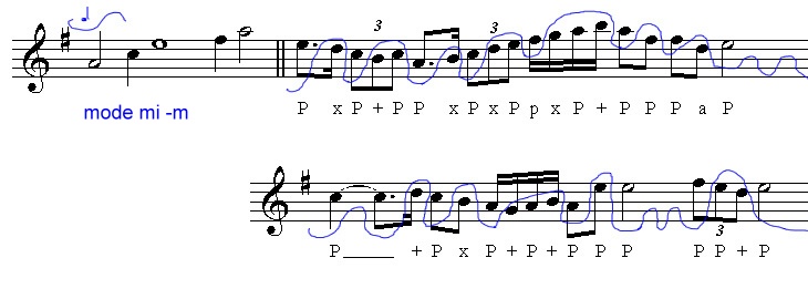La tonique choisie, mi dans cette mélodie, doit être placée au centre du lieu de cheminement. De part et d’autre, on ajoute ensuite les deux notes pivots en B les plus proches, soit do et fa#.