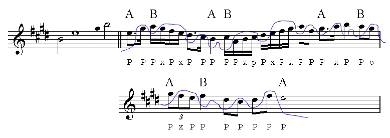 Pour que l’analyse soit plus efficace, on indique par les lettres correspondantes au-dessus du posé à chaque fois que l’on passe en A ou B. Ces lettres font partie de l’analyse car elles la déterminent. Elles permettent également de saisir en un coup d’œil le rapport équilibre A / déséquilibre B de chaque mélodie. Cela vous permettra également de mieux diversifier vos cheminements.