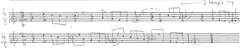 Dans cette série d’exercices, la barre de mesure se place devant le dernier posé de la dernière imitation, puis devant le posé de l’imitation précédente. On calcule ensuite le nombre de pulsations. On indique la mesure obtenue en début de portée. Ici il y a 3 pulsations ou 3 temps : la mesure est donc 3/4. En jonctions serrées on obtient une mesure à 2/4.