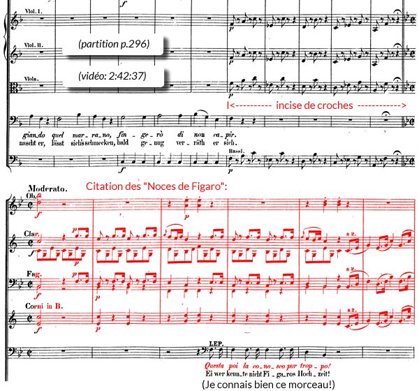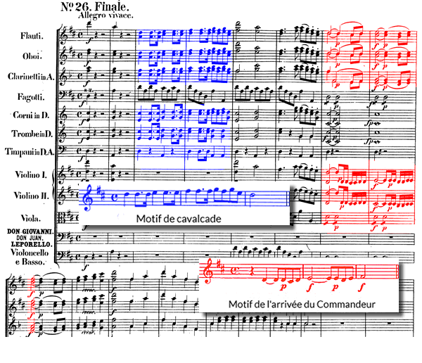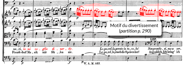Et ce ne sont pas les petites danses à la mode que Mozart insère ironiquement pour accompagner le divertissement gastronomique, qui dégèleront l’atmosphère glaciale de cette scène. D’ailleurs, l’incise [2] de croches serties de silences nous le rappelle avant la citation des Noces de Figaro. « Je connais bien ce morceau ! » dit Leporello. En effet, c’est Figaro qui chante le départ de Chérubin pour l’armée. Celui-ci est puni par le Comte, pour sa trop grande galanterie. Un clin d’œil comique comme il y en aura beaucoup d’autres, dans ce climat de terreur.