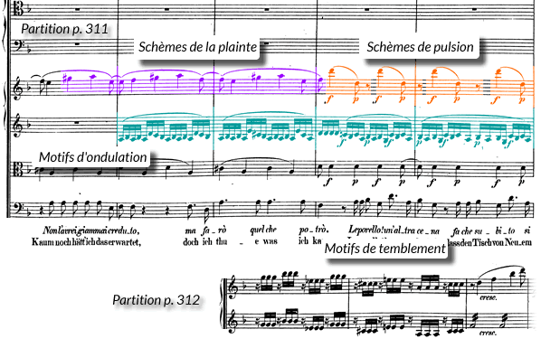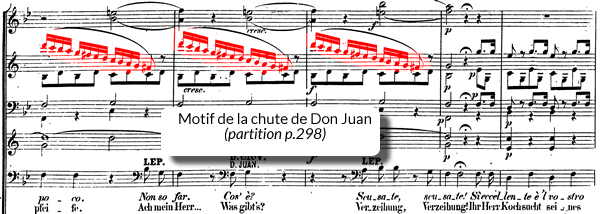 Don Juan, quand même surpris par une telle visite, ne perd pas la face : « Je ne l’aurais pas cru ; mais je vais faire ce que je peux ». Et il reprend ce même motif pour ordonner à Leporello : « un’altra cena fa che subito si porti ! Vite, apporte un autre dîner ! ». Devant une telle désinvolture, la musique se comporte comme si elle se détournait la face pour pleurer, comme si le cœur de Mozart se mettait à saigner de désolation. Ce n’est pas la première fois que, dans ce dramma giocoso, cet opéra buffa, Mozart laisse éclater sa douleur. Il suffit de se souvenir du sextuor de la scène VII au 2ème acte (partition p.221), et du chromatisme descendant sous les appels à la pitié de Donna Elvire. Mais ici, il faut prêter l’oreille et le cœur pour communier à ce motif de quatre notes dans lesquelles se reconnait le schème de la plainte ; deux sensibilisations sur la dominante et la sus-tonique , quatre fois répété sur une ondulation pantelante de double croches. Mozart pleure sur l’homme qui court à sa perte. Il ne peut se retenir d’éclater ensuite, en quatre énormes pulsions s’achevant sur un léger tremblement de trois doubles croches, extinction lente d’une vie moribonde, comme dans le « Oro suplex » de son Requiem. Tout ce passage, nous le connaissons bien, il nous est offert sans voix dès le début de l’Ouverture de l’opéra.