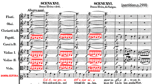 Tout à coup, surgit Donna Elvire. Il n’y a pas d’autre mot pour écrire ce bondissement, ce grondement de six croches qui résonnait déjà au début de l’Ouverture des Noces de Figaro, cet opéra « mondain » où l’utilisation de ce schème n’est pas anodine. Mais ici, c’est un début d’orage qui ébranle le ciel et le zèbre d’éclairs dansants, sur un rythme de valse.