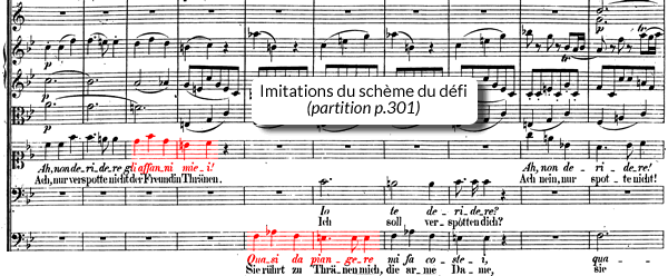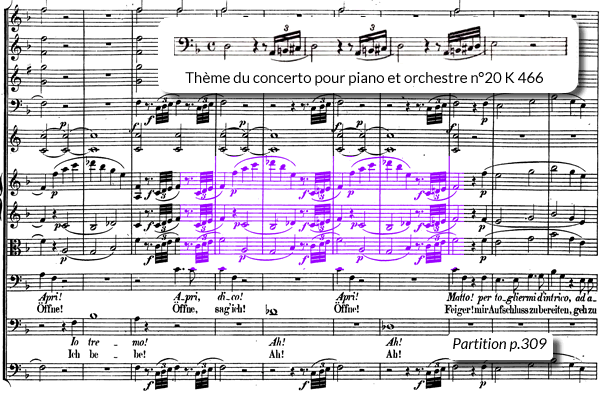 Aussitôt, on entend des coup violents frappés à la porte, sur un motif déjà annoncé deux ans auparavant dans un 1er thème du 1er mouvement du Concerto en ré mineur pour piano et orchestre de 1785.