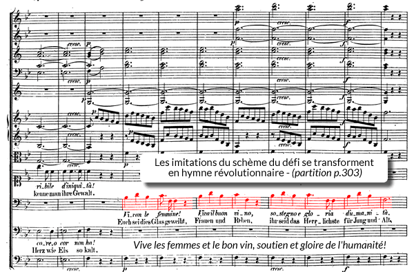 Sur le même dessin que le « pietade », Elvire crie à Don Juan : « change de vie ! ». Mais Don Juan ne peut que rester à sa place de cavalier qui ne sait que monter les chevaux et les femmes : « Brava ! Brave femme !! ». Vraiment, il ne comprend pas ! Alors, Elvire se met à hurler sur cette octave qui lui sert d’imprécation dans ses moments de désespoir : « Cor perfido ! » (partition p.302). Cette perfidie, Don Juan va l’assumer jusqu’au bout, en invitant son ancienne épouse à s’empiffrer avec lui. Et en portant un toast, il charge le motif du Défi, d’une immense dérision : « Vivan le femmine, viva il buon vino ! Vive les femmes, vive le bon vin ! » Et comme seul, Mozart est capable de le faire, sur un air populaire dont il a le secret et qui reste dans la mémoire sitôt entendu, il transforme le toast en chant révolutionnaire, rejoignant le « Viva la liberta » de la fin du 1er acte.
