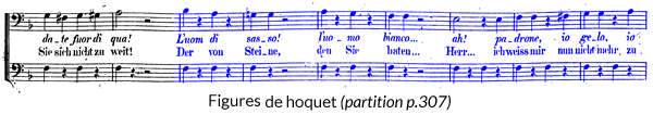 [3] A mettre en relation avec le « hoquet », qui est un procédé d’allègement de la polyphonie consistant à alterner rapidement des voix : leur décalage fait se correspondre tour à tour les notes et les silences. Inauguré dans les motets du XIIIème, le hoquet devient au XIVème un style de composition courant. Mais il a disparu à l’époque d’Okeghem. Mozart l’utilise ici pour décrire l’effroi.