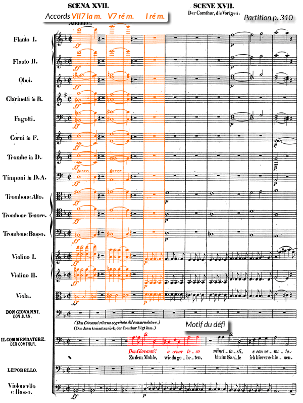 Tout cet intermède est balayé par l’immense bourrasque de l’accord de 7ème mineure diminuée de LA mineur, se résolvant sur l’accord de 7ème de dominante de RE mineur. Notons que ce dernier accord qui ouvre une porte sur l’Au-delà, est encore plus mystérieux, entouré de silence, avant le Lacrymosa du Requiem, comme avant les épreuves de Tamino et de Pamina. L’ancien commandant de garnison devenu le COMMANDEUR, statue de pierre, souvenir figé, l’homme pétrifié par excellence, entre solennellement, selon la mise en scène. Cette solennité évoque le rite, et il n’y a pas de rite sans mythe dont on fait mémoire. C’est à ce niveau, à notre avis, et non à celui d’un miracle chrétien, qu’il faut rejoindre la pensée de Mozart. Et le battement trochaïque, noire pointée, croche, sorte de marche funèbre ou de glas haletant, ajoute encore à cette liturgie des morts, sur lequel retentit le Grand Appel : « Don Giovanni », cadence parfaite, jamais aussi bien honorée qu‘en cet instant où se concentre l’énergie de la Terreur. Dans le ré mineur des angoisses et des regrets, Mozart restitue au Commandeur, le motif du défi : « A cenar teco, invitasti, à dîner, je t’invite ! »