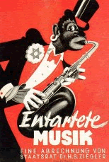 Sur l’affiche : un noir, jouant du saxophone, portant à la boutonnière de son smoking de concert l’étoile de David. Un noir (un américain, donc un esclave, un sous-homme) , un saxophone (instrument moderne exclus de la nomenclature classique), un smoking (tenue emblématique du chef d’orchestre, dans l’exercice de sa fonction dirigeante), l’étoile de David (marquage de la culture juive dominante). Musique métissée donc dégénérée, dirigée par la « juiverie ». Hans Severus Ziegler, commissaire de l’exposition explique : « Ce qui est réuni dans l’exposition "Entartete Musik" représente le reflet d’un véritable sabbat de sorcières et du bolchevisme culturel le plus frivole, aux plans spirituel et artistique ; c’est aussi le reflet du triomphe de la sous-humanité, de l’arrogante impudence juive et d’un complet abrutissement intellectuel… La musique juive et la musique allemande demeurent étrangères. Les lois de la musique juive ou les constructions intellectuelles et les doctrines du faux-semblant, la physique et la physiologie juives du son se développent actuellement de façon clairement prédominante dans le monde musical de sang allemand, de telle sorte qu’il existe des imbéciles beni-oui-oui allemands qui ne peuvent se soustraire aux influences d’une race inférieure à cause de leur propre faiblesse et de leur manque de force créatrice et d’inspiration. La dégénérescence de la musique et de la création musicale allemandes naît alors par la force des choses. La musique dégénérée est ainsi au fond une musique non allemande, pour laquelle la partie saine du peuple ne trouvera également aucun organe de réception, aucune émotion et aucune réceptivité ».