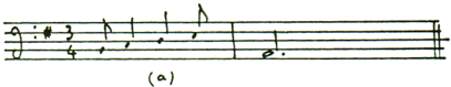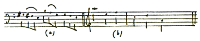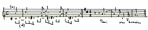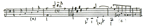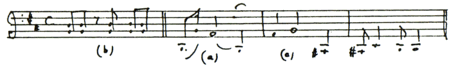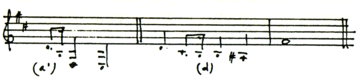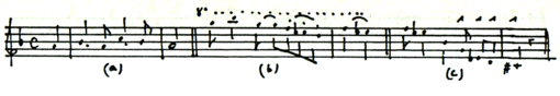 Le premier motif antécédent (a) sur un rythme haletant (b) aux intervalles distendus, est suivi d’un conséquent (c) encore plus écartelé et douloureux.