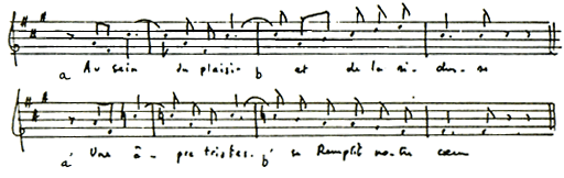 Accompagnant ce motif, plusieurs contre-motifs : le premier (b) de deux notes conjointes à intervalles chromatiques, tendres et plaintives, le second (c) d’une descente arpégée, légère et passionnée. Ainsi apparaissent deux expressions proposées par le texte : la misère de l’homme et la réponse du ciel.