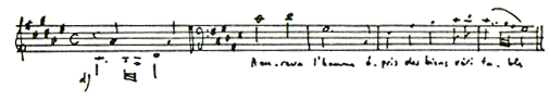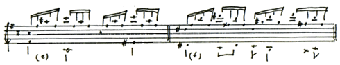 Cette évocation du ciel est confiée à deux autres motifs << conséquents >>, et eux-mêmes s’opposant l’un à l’autre : le premier (d) dans une affirmation ascendante sur les notes-pivots de DO # majeur, le second (e) dans une gamme descendante plus consolatrice.