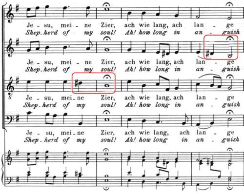 On notera qu’il s’agit pourtant de cadences parfaites qui concluent à chaque fois une phrase du choral et que la sensible est située aux voix intermédiaires. Lorsqu’elle se trouve aux extrêmes, elle se résout de manière plus naturelle vers sa tonique.
