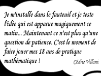 Dans ce livre, il raconte les circonstances et les différentes étapes qui ont mené sa découverte. Illumination, ligne directe, Cédric Villani évoque sans détour la part de mystère du processus créatif entourant ses recherches : « Je passe en mode semi-automatique et peux ainsi faire usage de toute mon expérience… mais pour en arriver là, il aura fallu un petit coup de fil du Dieu des mathématiques, la fameuse ligne directe se traduisant par une voix qui résonne dans votre tête. Vous avez alors une petite illumination vous incitant à vous diriger vers une certaine direction. C’est très rare, il faut l’avouer ! ».