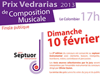 Les lauréats doivent fournir à l’organisateur les partitions de chaque instrumentiste. Celles-ci sont remises aux musiciens professionnels, dont des professeurs du conservatoire de Verrières, qui les interprèteront lors de la finale publique. Pour cette édition, le jury y décernera le Prix Vedrarias 2013 de Composition Musicale et le public sera invité à voter pour décerner le Prix du Public 2013. L’oeuvre primée quant à elle sera portée au-delà du concours puisqu’elle sera programmée lors d’un évènement musical en avril 2013 au Colombier.
